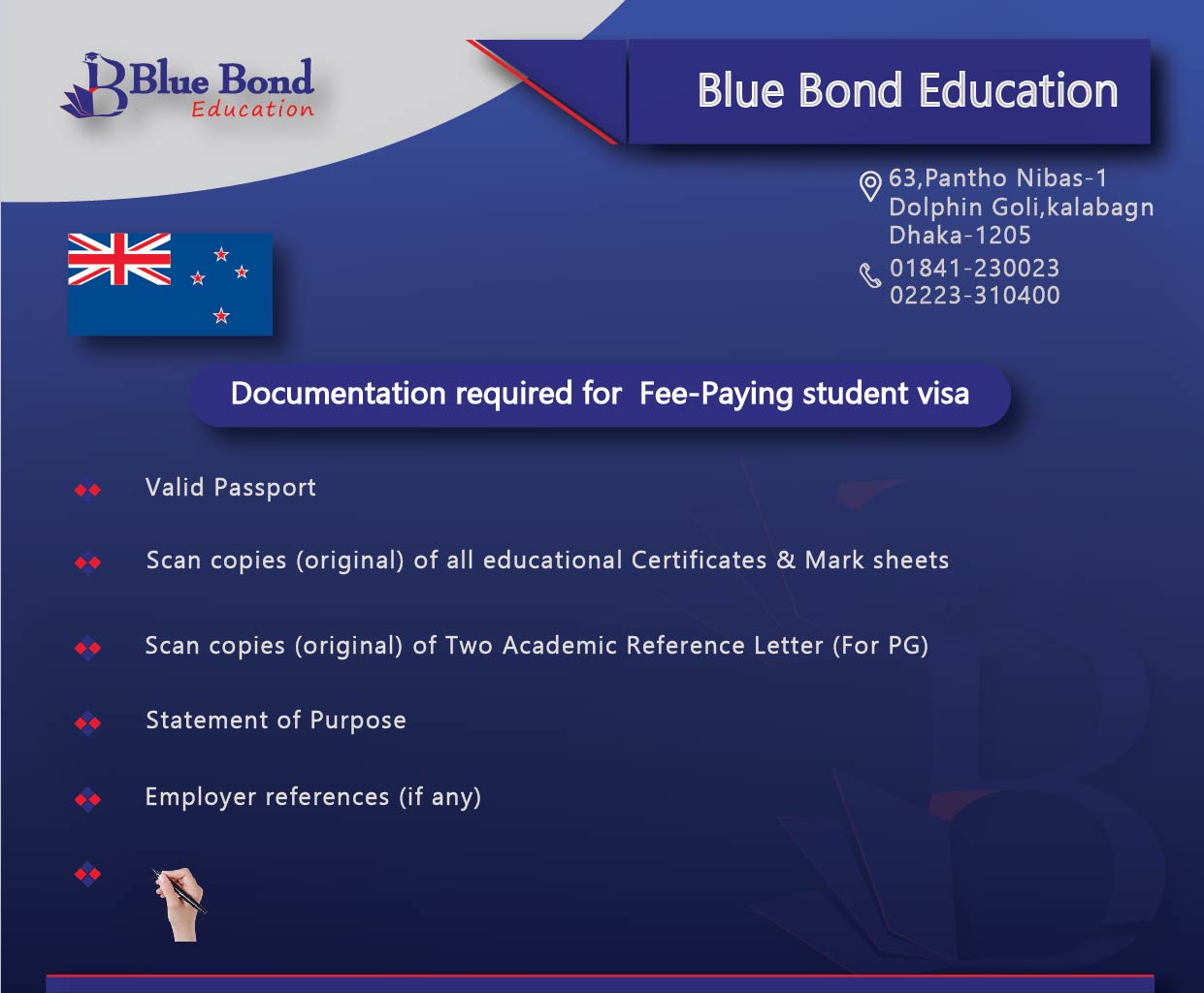 Students all over the world comes to study in New Zealand as it provides quality education along with the offer of great outdoor enjoyments in holiday! This country is also a gold mine for business minded people where it offers Work and Residence VISA who owns or operates or plans to invest money here! So take the opportunities with the assistance of Blue Bond where earning and learning moves simultaneously!!